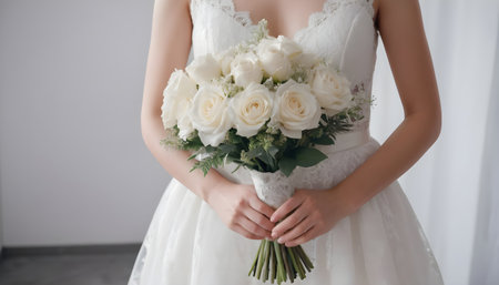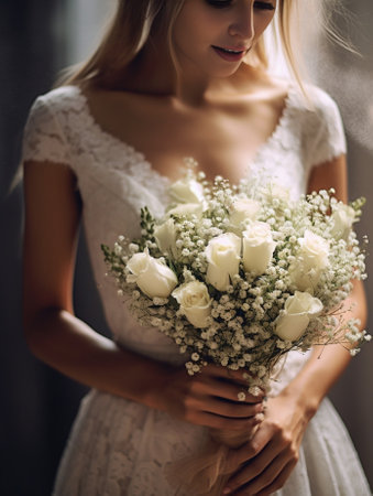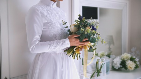 Beautiful bride in her wedding day in all white wedding dress, holding her flower arrangement bouquet.