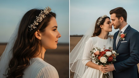 An image of a very attractive Mexican young woman, dressed in a designer wedding dress and with a veil over her face, posing in front of the camera directly with an attitude of reflection and serenity, sunset light and fill flash