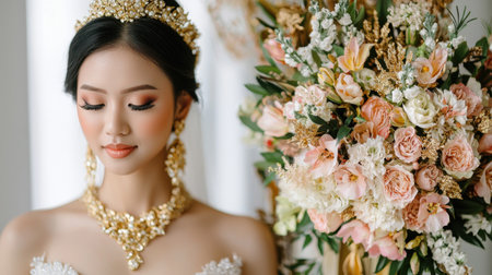 Bride holding a bouquet on hand for wedding,Beautiful asian woman smiling and happy,Romantic and sweet moment