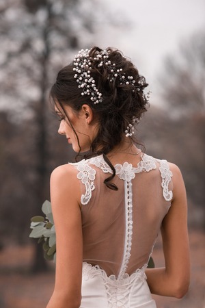 Beautiful bride. Wedding hairstyle and make up. Wonderful pretty bride with wedding bouquet.Closeup portrait of young pretty bride from her back.Beautiful bride with fashion wedding hairstyle.Wedding.