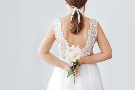 The back view of the bride in lace dress holding the wedding bouquet of white roses.