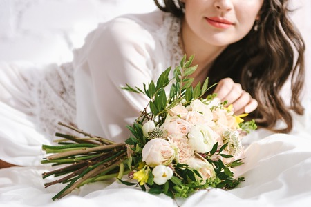 Portrait of a young charming bride in front of a wedding ceremony with a big beautiful bouquet in white lingerie. on a large bed. Close-up on a bouquet