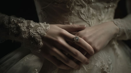 cropped view of bride with diamond ring on finger holding wedding bouquet