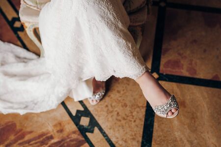the bride sits on a chair, at the bride's feet there are designer high-heeled shoes decorated with stones