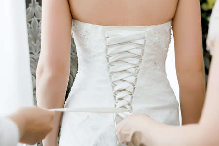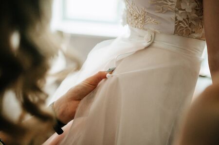 A white wedding dress is knitted to the bride. A bride is being helped to wear the wedding dress. The bride's preparation for the wedding