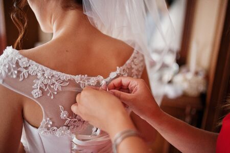 The back of the bride in a wedding dress. Moms and womans hands help fasten the clasps at the back.