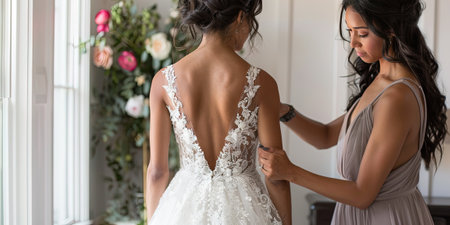 On the wedding day, a bridesmaid helps the bride to put on her wedding dress.