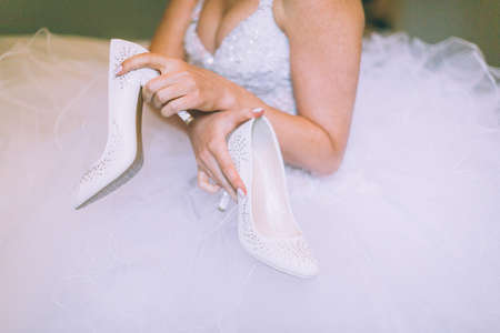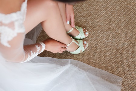 bride puts on wedding shoes of mint color. Wedding concept, morning of the bride, preparation