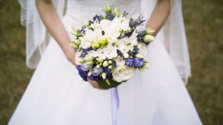Close up of vivid wedding bouquet at young bride on green grass background, family and celebration concept. Slim woman in white dress holding beautiful wedding bouquet of purple and white roses.