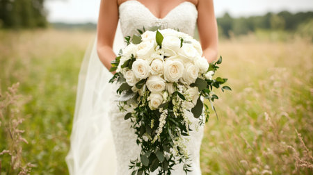 A bride walking through a field holding a cascading bouquet of white roses and greenery
