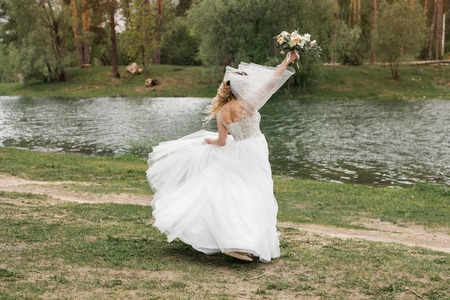 Photographer capture a Beautiful brunette woman bride in a garden park in white wedding dress, curly hairstyle and a smile. warm weather, outdoors. Backstage