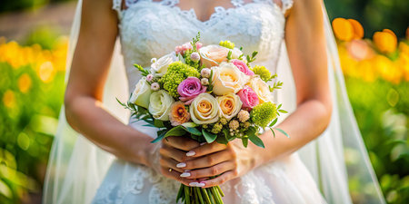 Beautiful pastel wedding bouquet in bride's hands, bokeh background, wedding concept, banner.