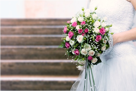 Bridal bouquet with pink and cream roses in the hands of the bride. Wedding concept.