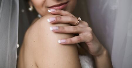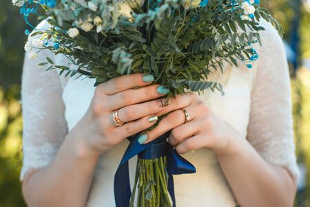 Close up view on bride arms with nail art and ring on her fingers holding rustic wedding bouquet with tourquoise colour details.