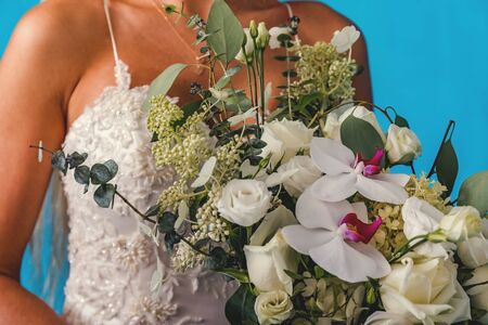 Bridal bouquet on the wedding day. Flowers for the bride. Small wedding bouquet close-up.