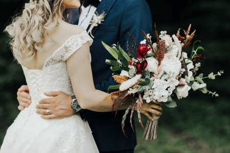 Beautiful wedding bouquet of flowers in the hands of the newlyweds