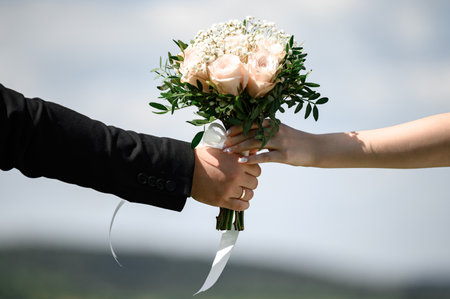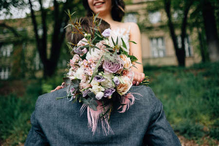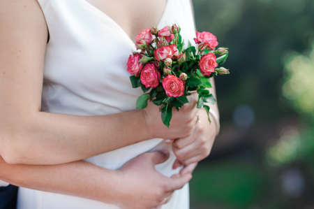 Bouquet for the bride in the hands of the grooms close-up on the background of the sky, fresh flowers for the bouquet.