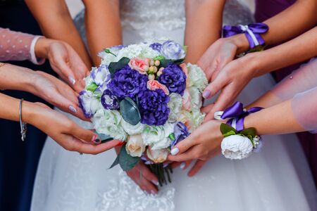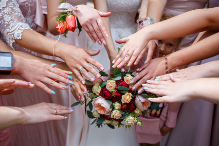 Bride and bridesmaids standing in circle and touching wedding bouquet. Hands with flower bracelets. Wedding day concept.