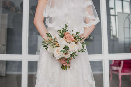 Bridal bouquet, hold the wedding bouquet in your hand, satin ribbons adorn the wedding bouquet of roses, on the background of the brides dress, fresh flowers, made by a florist
