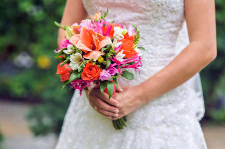 Beautiful wedding bouquet in hands of the bride