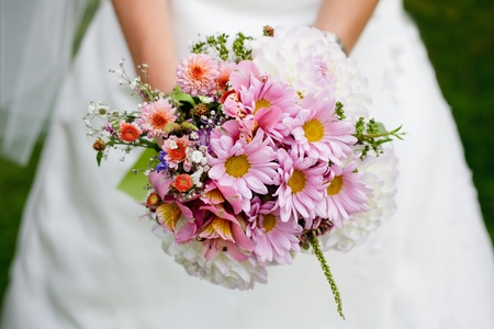 Bride with a wedding bouquet of flowers.