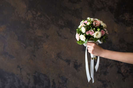 Female hand holding a wedding bouquet on a dark background