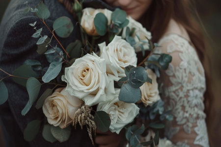 Close-up of brides hands with beautiful wedding bouquet. Generative AI.