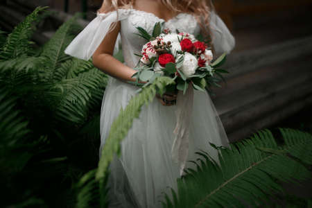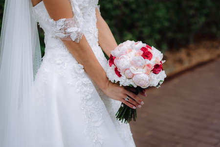 Bride holds a wedding bouquet, wedding dress, wedding details outdoor