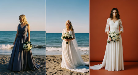 A triptych of a woman in a white wedding dress standing on a beach, holding flowers and a purse, with the ocean and sunset in the background, showcasing her elegance and serenity.