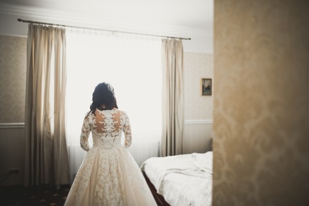 Beautiful bride girl in wedding dress posing in the room with window.