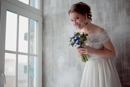 Happy and beautiful bride with bouquet of flowers is looking through the window glass