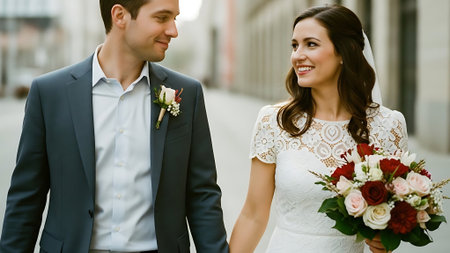 A newly married couple, a man in a black suit and a woman in a white gown, walk hand in hand. The scene evokes love, commitment, and celebration on their special day, with soft lighting and an intimate feel.