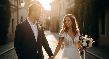 A smiling bride and groom, dressed in formal wedding attire, walk hand in hand down a charming cobblestone street lined with buildings, bathed in warm sunlight.