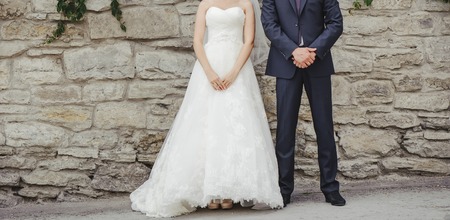 Groom and Bride embracing next to red brick wall. Hands of newlyweds together. Wedding Couple.