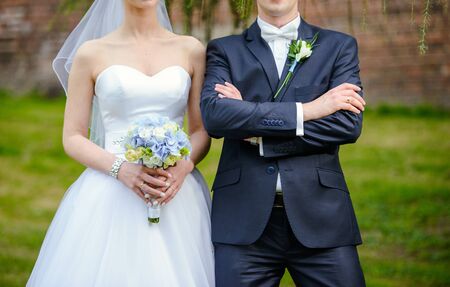 Beautiful bride and groom on their wedding day. Bride holding a bouquet of flowers