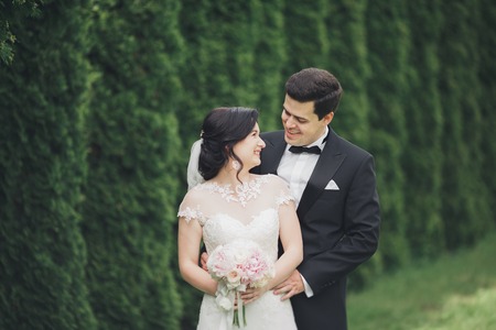 Romantic, fairytale, happy newlywed couple hugging and kissing in a park, trees in background