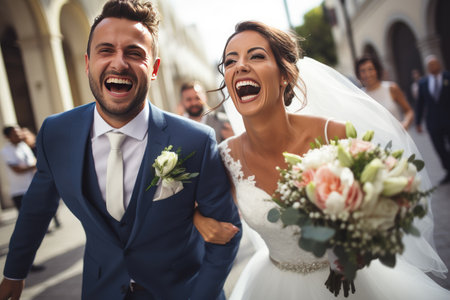 Joyful couple celebrates their wedding day in a beautiful garden during the afternoon