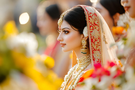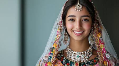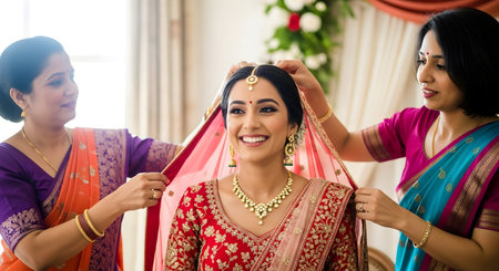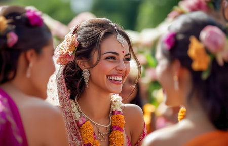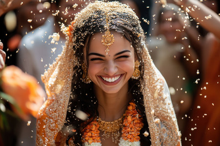 Smiling indian bride in traditional attire at joyful wedding celebration. concept of cultural tradition, bridal happiness, festive celebrations.