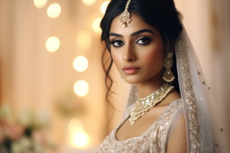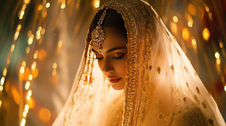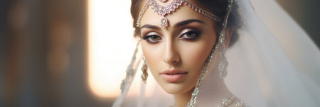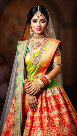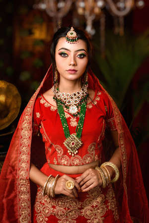 Magnificent young Indian bride in luxurious bridal costume with makeup and heavy jewellery with classic vintage interior in studio lighting. Wedding Lifestyle and Fashion