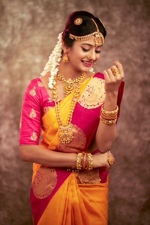 Portrait of very beautiful young Indian lady in luxurious costume with makeup and heavy jewellery posing fashionable in studio lighting indoor. Religious Lifestyle Festive Fashion.