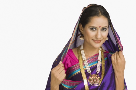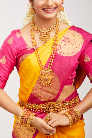 indian woman in saree with jewelry on white background close up
