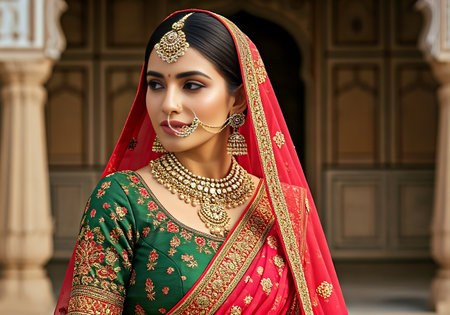 A Traditional Indian bridal woman wearing royal ethnic jewelry inside heritage palace interior