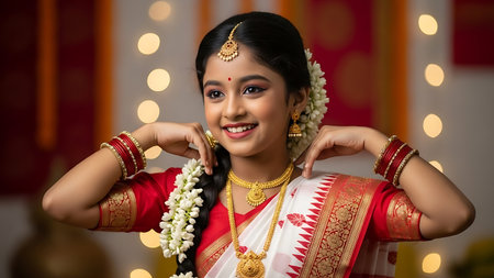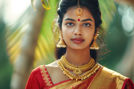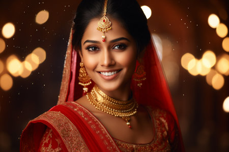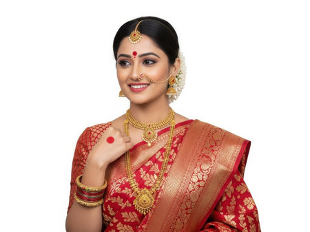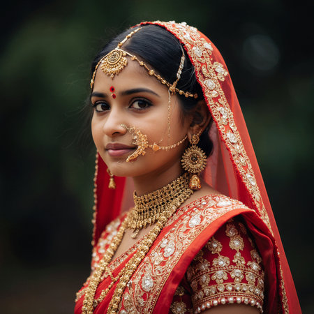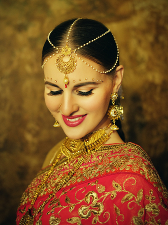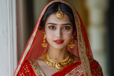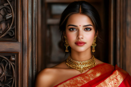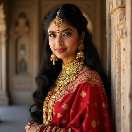 Young woman in Indian red sari with traditional jewelry.