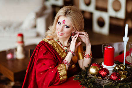 Beautiful and sensual blonde girl in Indian red saree sitting at the holiday table