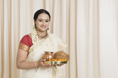South Indian woman holding pooja thali