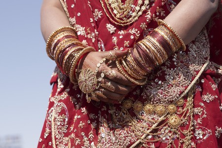 Hands of an Indian bride adorned with jewelery bangles and painted with henna.