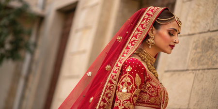 Indian bride dressed in Hindu red traditional wedding clothes sari embroidered with gold jewelry