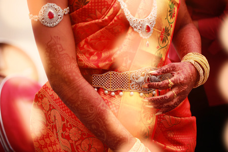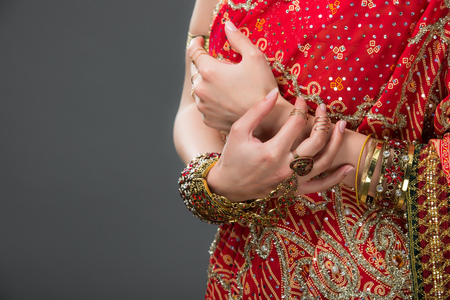 Beautiful female hands of an Indian bride with mehndi and jewelry during a typical Hindu wedding.