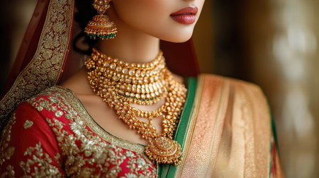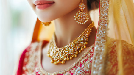 Elegant asian woman showcasing ornate gold necklace and earrings, highlighting intricate jewelry craftsmanship. concepts of luxury, traditional fashion, artistic design.