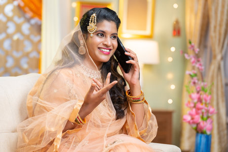 Indian muslim woman busy by calling or talking on mobile phone at home during ramadan - concept of islamic festival,traditions and technology.